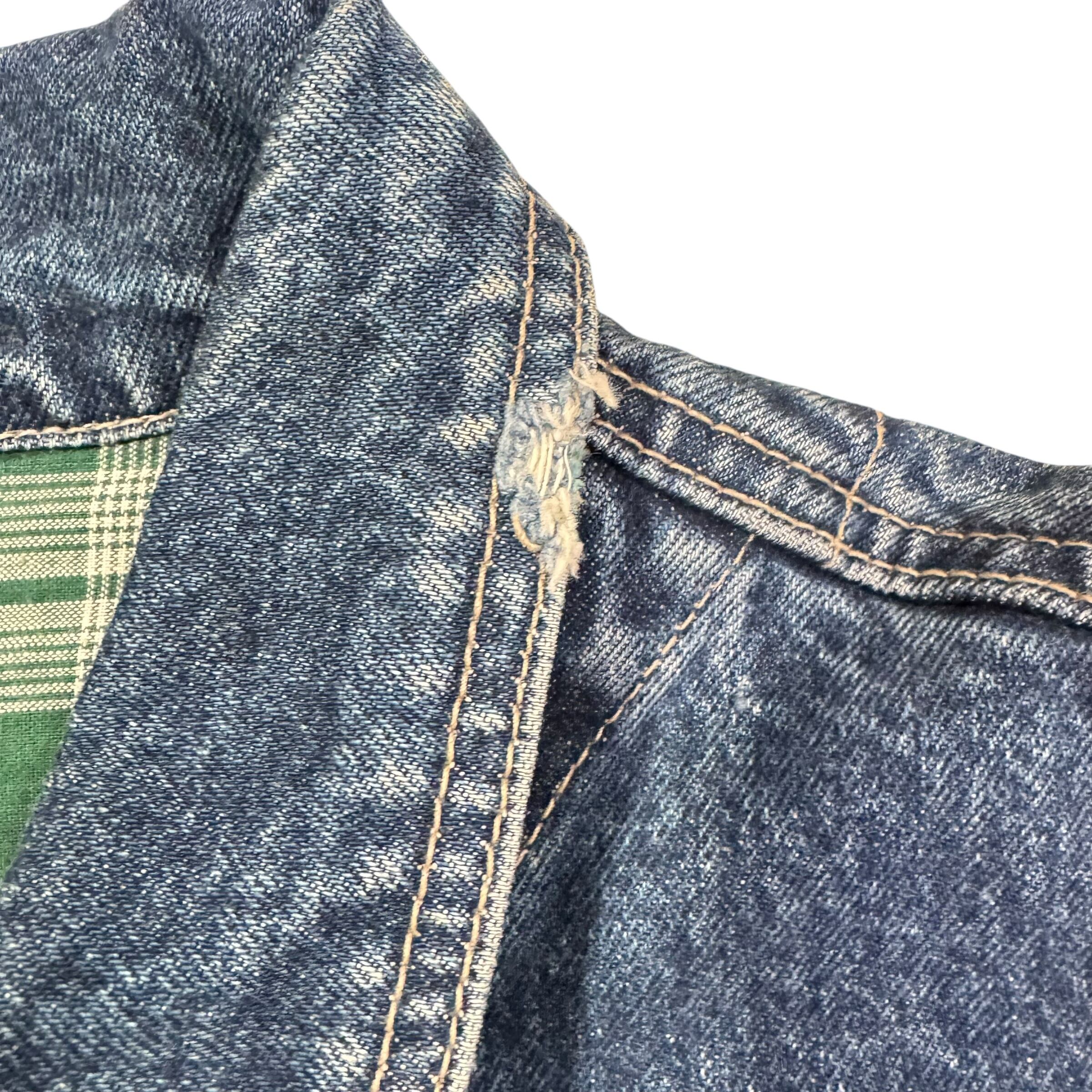 襟元に破れ、袖の焼けがあります。ヴィンテージ古着特有の使用感が見られます。ビンテージ品の風合いにご理解のある方のみお願いします。